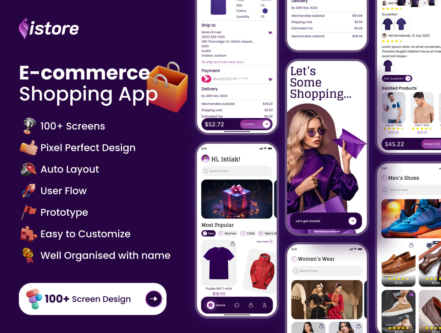 iStore is an eCommerce app where you can sell all kinds of products. In this file you will get 100+ UI screens which are flow-wise and organised with names, also using “prototype”, which helps your designer and developer to maintain “User Flow”.
